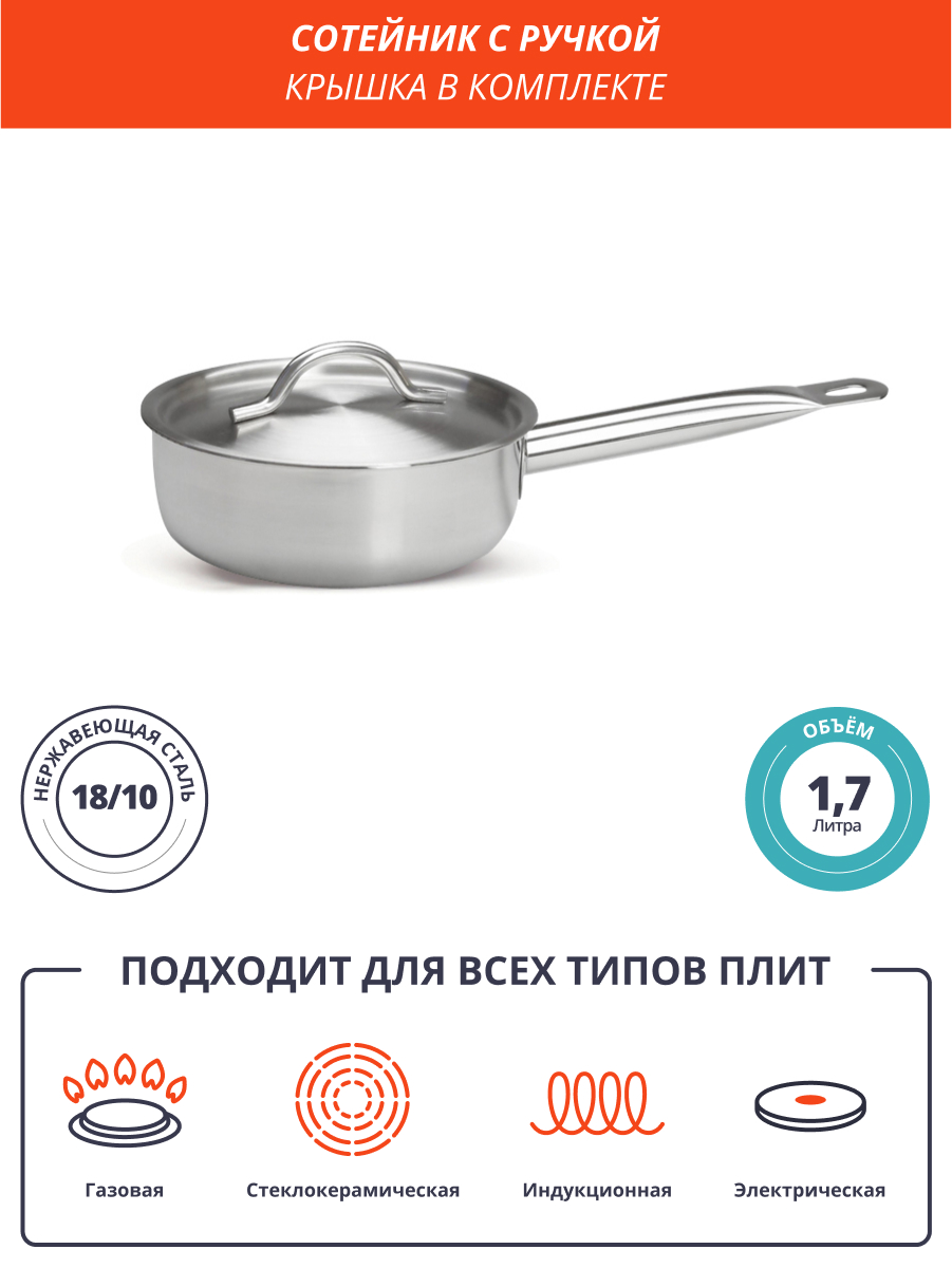 Представляем вам сотейник из нержавеющей стали с объемом 1,7 литра и диаметром 180/65 мм. Этот идеальный выбор для профессиональных поваров и шеф-поваров, которые ищут качественные кухонные принадлежности. Также этот сотейник подойдет любителям готовить дома, которые ценят надежность и долговечность. Владельцы ресторанов и кафе найдут в нем надежную и удобную посуду для своего бизнеса. Изготовленный из нержавеющей стали, этот сотейник отличается прочностью и гигиеничностью. Также он станет стильным и элегантным элементом интерьера вашей кухни. Не упустите возможность приобрести этот уникальный сотейник из нержавеющей стали ведущего производителя кухонной посуды.
