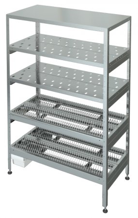 Ножки с регулируемыми опорами — оцинк. /нерж. сталь t=1,0 мм, выполнены из уголка40х40мм с подгибом краёв во внутрь. Полки — нерж.сталь, AISI 430 t=0,5 мм. Решетка изпроволоки Ø5мм.