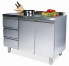 Стол-тумба относится к высокому классу профессионального кухонного оборудования по отношению к разделочным столам. Стол-тумба может использоваться и как обычный разделочный стол при формировании рабочей зоны на кухне. Однако, благодаря наличию закрытого объема, его также можно использовать для хранения посуды, инвентаря, столовых приборов и сухих видов продуктов. Стол-тумба с бортом. Ножки регулируемые по высоте Стол полностью изготовлен из нержавеющей стали AISI 430, Стол-тумба имеет 2 распашные дверцы и 3 выдвижных я